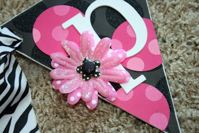 I chose to create a super fun hot pink, black, and zebra print "PARTY" banner. I started with a Maya Road chipboard banner book and added lots of fun papers, glitter letters, flowers, and bling. I tied them all together with tulle and added a little zebra print ribbon.